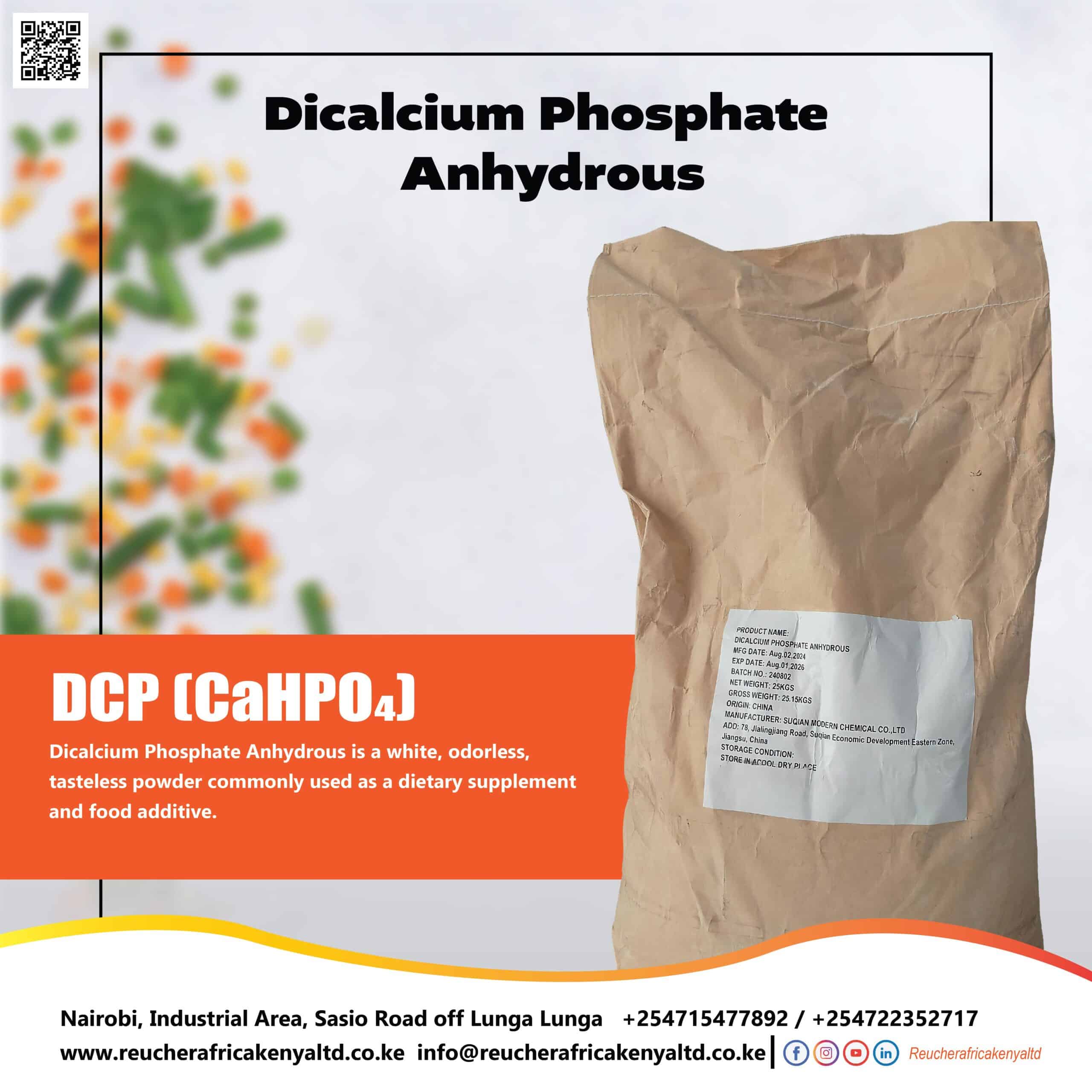 Dicalcium Phosphate (Food Grade) contains about 29–31% calcium and 22.5–23.5% phosphorus, with high purity and minimal impurities. It appears as a white, free-flowing powder, has a neutral pH (6.5–8.0), and is slightly soluble in water. Heavy metals, arsenic, and fluoride are present in very low, safe limits, making it ideal for food and supplement applications.